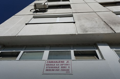 Na natpisu stoji: Zabranjeno je igranje sa loptom i stvaranje buke u okolini ove zgrade, ZEV.