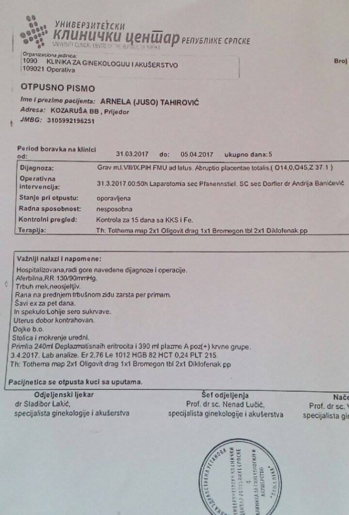 Redakciji portala Avaz.ba, Tahirović je proslijedio i otpusno pismo iz banjalučke bolnice u kojem piše da je njegova supruga porođena carskim rezom te da je dijete rođeno mrtvo.