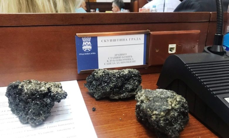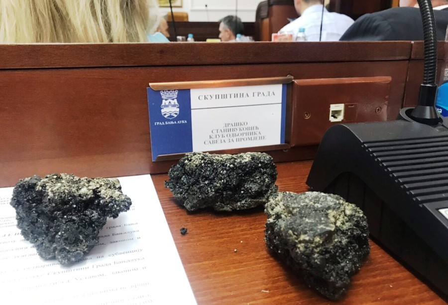 Odbornik PDP-a Draško Staniovuković, nastavio je priču o, kako ga naziva, predizbornom asfaltu, te ovaj put komade istog donio na sjednicu gradskog parlamenta, kako bi pokazao gradonačelniku i načelniku kako su asfaltirane gradske ulice.