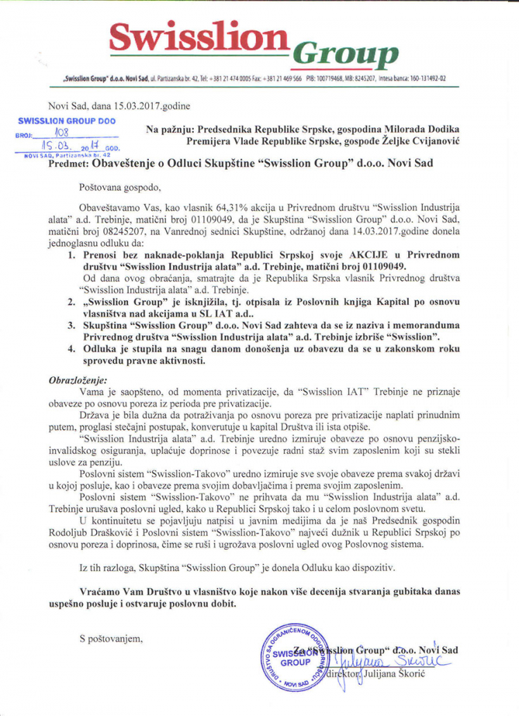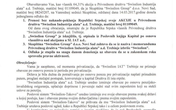 U obavještenju “Swisslion grupe”, koje je upućeno predsjedniku Republike Srpske Miloradu Dodiku i premijeru Željki Cvijanoviće, navodi se da se “od danas Republika Srpska može smatrati vlasnikom `Swisslion industrije alata`” Trebinje.
