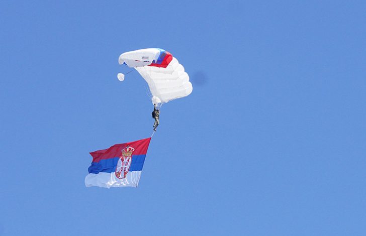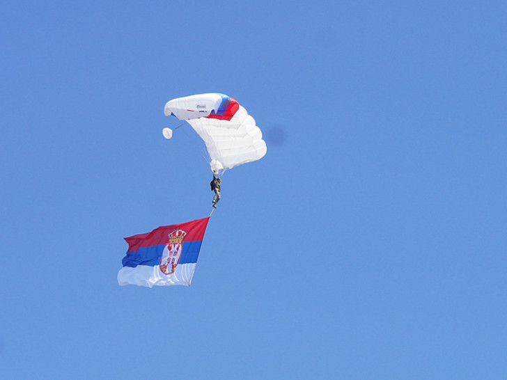 Kraj vojne parade uveličao je padobranski skok pripadnika 63. padobranske brigade koji su nosili zastavu Republike Srbije i Vojske Srbije uz završni pozdrav aviona MiG-29.