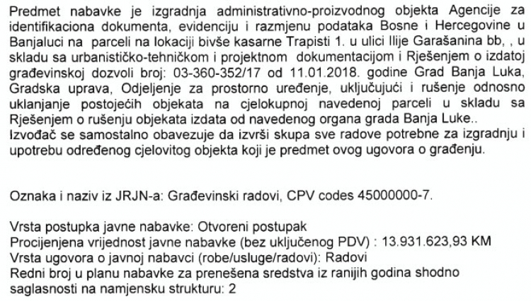 -Predmet nabavke je izgradnja administrativno-proizvodnog objekta Agencije za identifikaciona dokumenta, evidenciju i razmjenu podataka u Banjaluci na parceli na lokaciji bivše kasarne Trapisti 1 i rušenje postojećih objekata na cjelokupnoj navedenoj parceli- navedeno je u tenderskoj dokumenatciji koja je posjedu Capitala.
