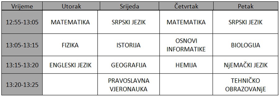 - Osmi razred, nastava traje od 12:55 do 13:25
