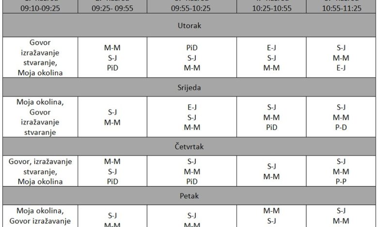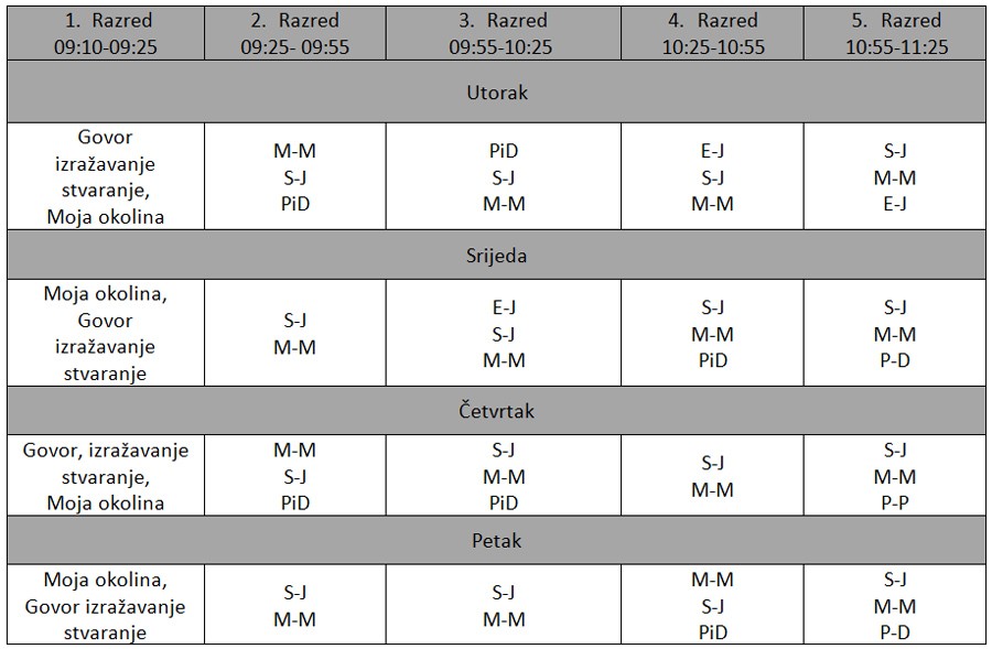 Časovi predmetne nastave počinju časovima za šesti razred, pa potom slijedi nastava za sedmi, osmi i deveti razred, sa završetkom u 13.55 .
