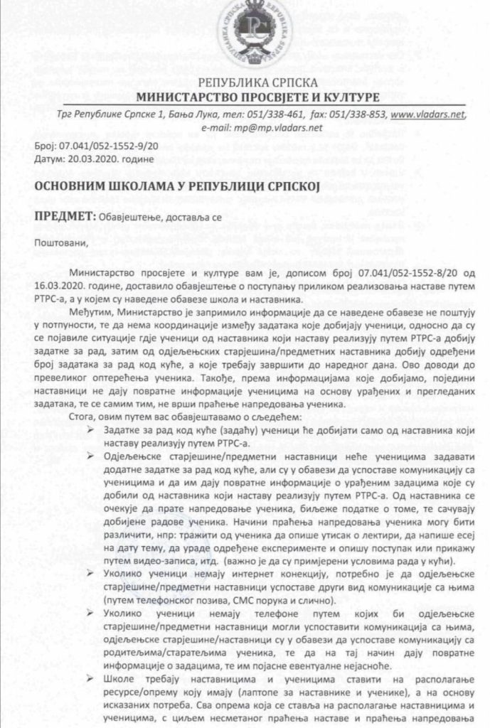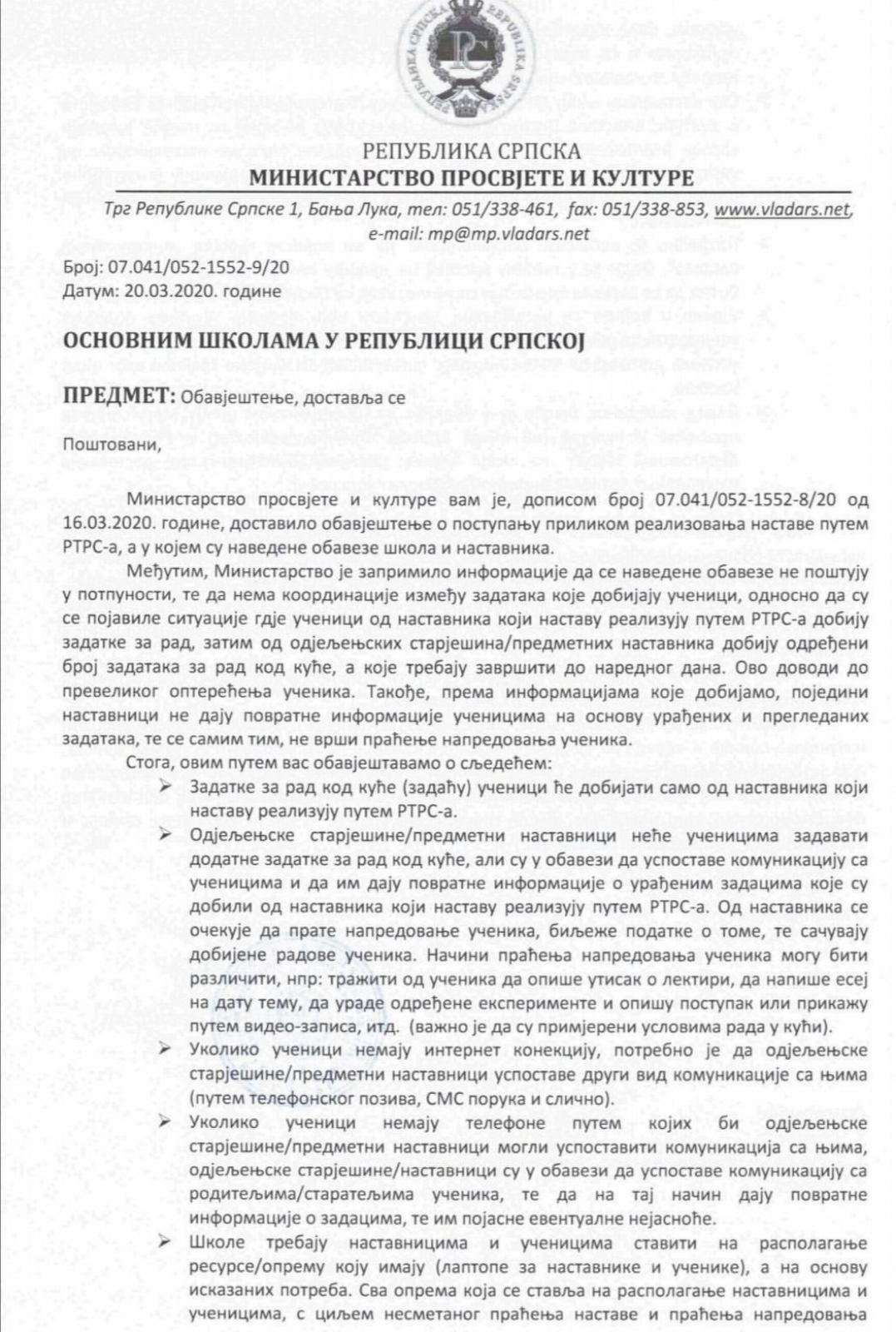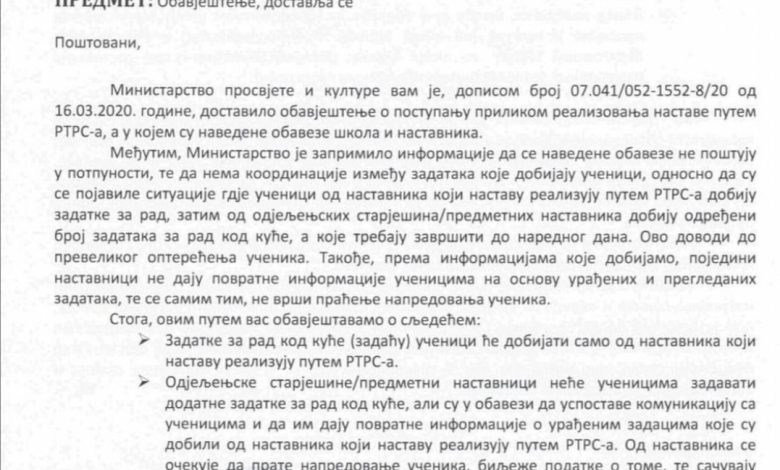 Ministarstvo je dobilo informaciju gdje učenici od nastavnika koji nastavu realizuju putem RTRS-a, dobiju zadatke za rad, zatim od odjeljenskih starješina/ predmetnih nastavnika dobiju određeni broj zadataka za rad kod kuće, a koje trebaju završiti do narednog dana. Ovo dovodi do prevelikog opterećenja učenika.