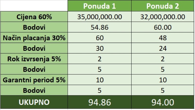 Sve je postavljeno tako da 60 od mogućih 100 bodova dobija ponuđač sa najnižom cijenom, a 30 onaj ko ponudi najduži rok plaćanja i po pet za garanciju i rok izvršenja. To praktično znači da teoretski može proći ponuđač koji dostavi 3 miliona maraka skuplju ponudu, ako je spreman da na isplatu čeka godinu dana duže.
