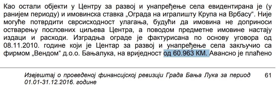 U nedavno objavljenom izvještaju o reviziju finansija grada Banjaluke, uvjerljivo najveći broj utvrđenih nepravilnosti odnosi se upravo na poslovanje Centra za selo. Od prije godinu dana, na čelu Centra se, da ironija bude veća, nalazi upravo Draško Ilić, čelnik FK „Krupa“ kojem je Centar plaćao ogradu, iako sa fudbalom nemaju nikakve veze.