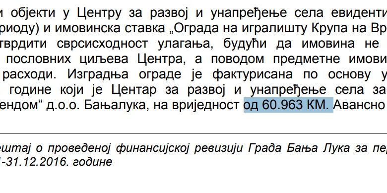 Tako je donedavni direktor banjalučkog Centra za razvoj i unapređenje sela Milenko Šarić platio 60.000 KM izgradnju ograde oko stadiona fudbalskog kluba „Krupa“, iako se novac ove gradske firme može koristiti isključivo za razvoj poljoprivrede,