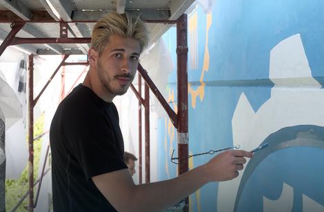 Studenti završne godine Akademije umjetnosti Ognjen Milovčević i Nikola Kašterović već 2 dana vredno rade na velikom plavom muralu koji bi trebao biti gotov sutra.