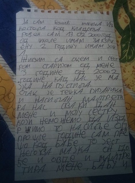 – On nam je baš blizu. Malo je ovo mesto. Napisao sam pismo jer želim da nam neko, bilo ko, kome ne treba kuća, da da je koristimo. Nije bitno gde je ni kakva je, već da je što dalje od njega. Plašimo se mnogo – priča dečak.