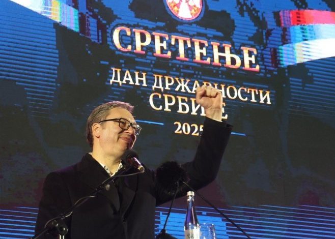 Vučić je poručio da su se okupili u Sremskoj Mitrovici na skupu “Srešćemo se na Sretenje” zato što je Srbija ugrožena, napadnuta spolja od onih koji manipulišu djecom u Srbiji kako bi osvojili vlast, što im narod nije dao na izborima.