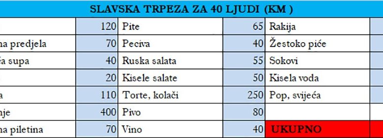 Jedna malo opremljenija slavska trpeza za oko 40 gostiju u prosjeku košta oko 1.600 maraka, što znači da domaćini za ovaj dan u godini potroše skoro dvije prosječne plate.