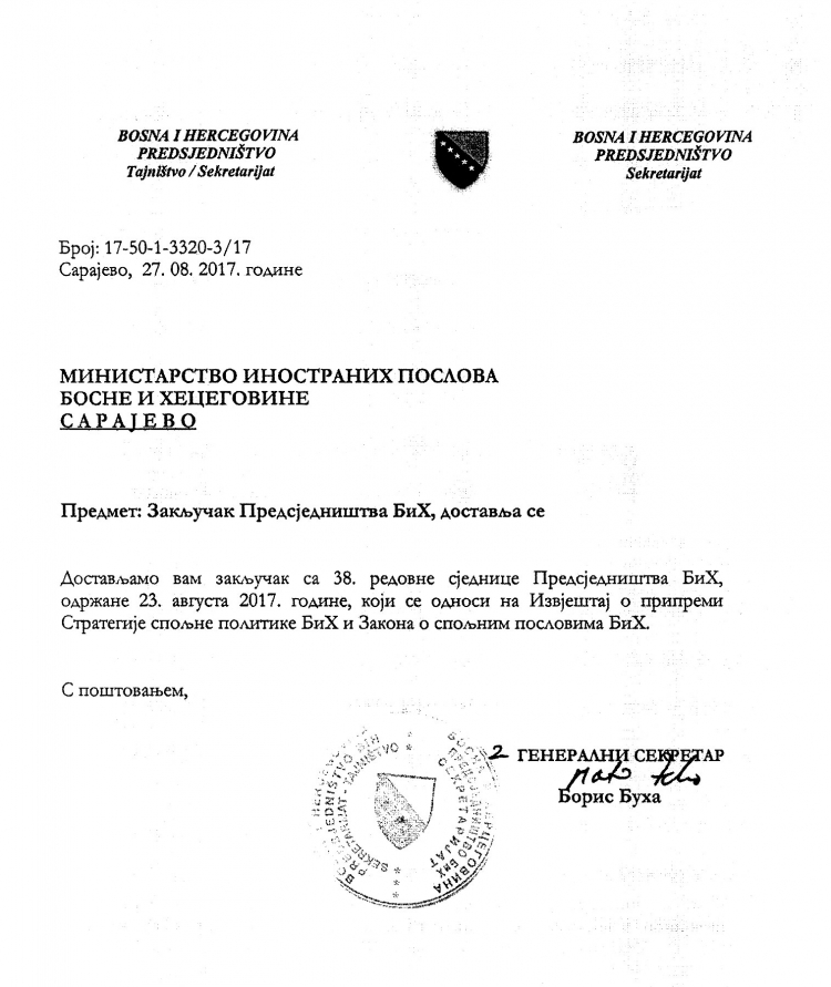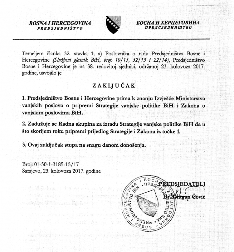 Predsjedništvo BiH zadužilo je radnu grupu za izradu strategije vanjske politike da u što kraćem roku pripremi prijedlog strategije i zakona o vanjskoj politici BiH.