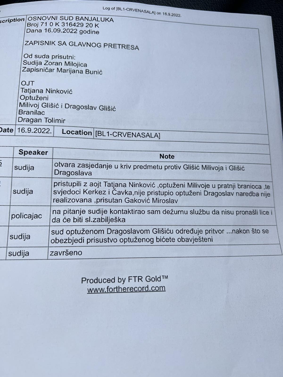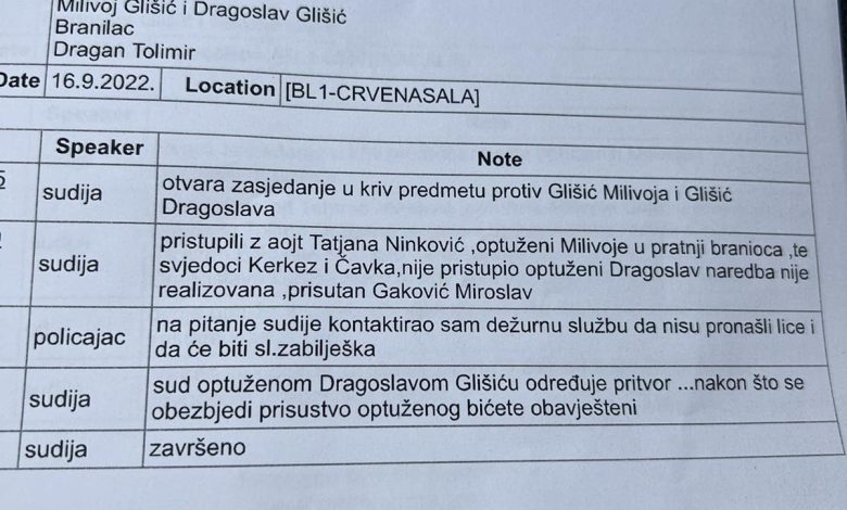 – Dakle, prijetnjom da će neposredno upotrijebiti silu, optuženi su spriječili službeno lice u institucijama Republike Srpske u vršenju službene radnje koju je preduzelo u okviru svojih ovlašćenja i ugrozili su sigurnost lica prijetnjom da će njega ili blisko lice lišiti života. Čime je osumnjičeni Milivoje Glišić učinio krivično djelo sprečavanje službenog lica u vršenju službene radnje, a osumnjičeni Dragoslav Glišić krivično djelo sprečavanje službenog lica u vršenju službene radnje u sticaju sa krivičnim djelom ugrožavanje sigurnosti – navodi se u optužnici.