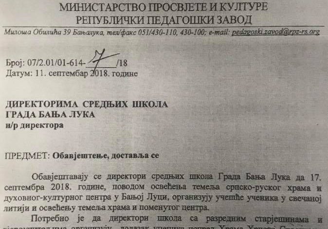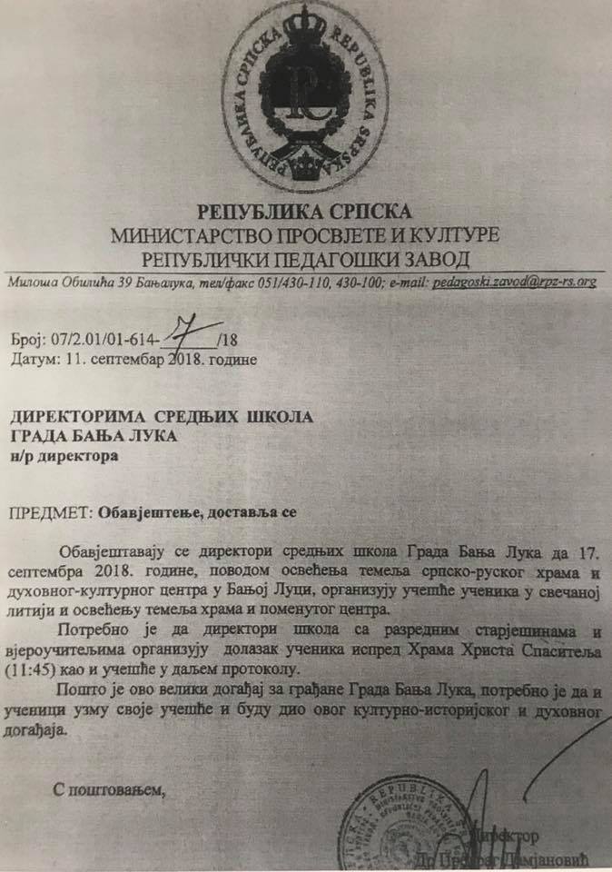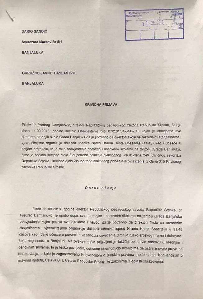 Banjalučki advokat Dario Sandić podnio je krivičnu prijavu Okružnom javnom tužilaštvu protiv Predraga Damjanovića direktora Republičkog pedagoškog zavoda RS. Razlog za podnošenje prijave je dopis koji je Damjanović uputio školama u Banjaluci u kojem je pozvao direktore da obustave nastavu i djecu dovedu na osveštenje temelja rusko-srpskog hrama, piše blmojgrad.com.