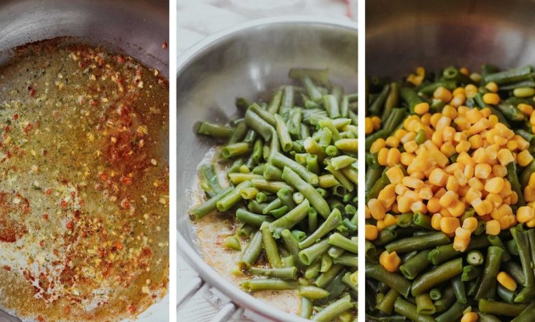 U tavi otopiti veći kocku maslaca, pa dodati vegetu i crvenu papriku. Kada se blago uprži dodati mahune i konzervisan kukuruz šećerac.